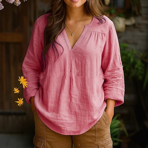 Blusa Donna Cotone Lino Colore Uni Elegante Casual Maniche Lunghe Collo a V Top Regolari Quotidiano Festivo Pocket Nero Bianco Rosa Blu Estate Primavera