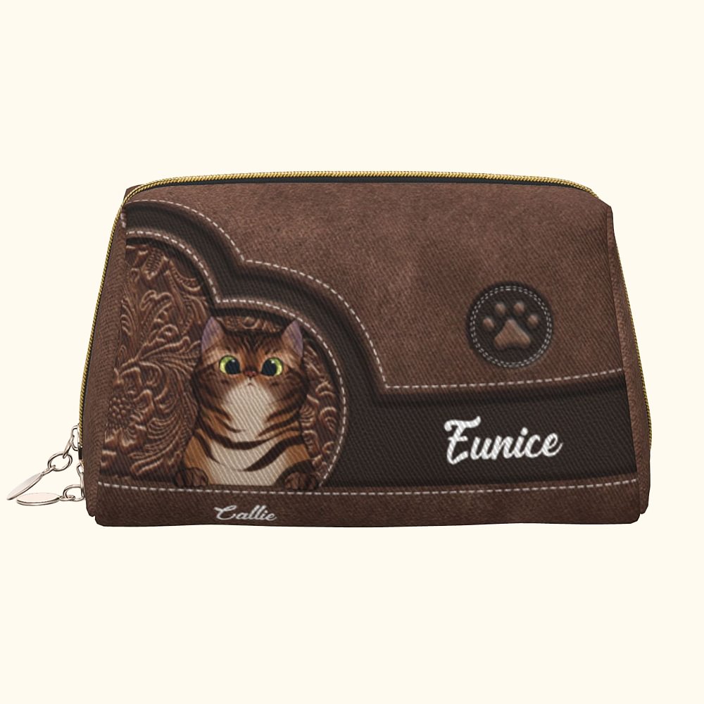 Gepersonaliseerde Cartoon Cat Retro Lederen Waterdichte Open Wijd make-up tasje met naam Travel Essentials Verjaardagscadeau voor vrouwen Pet Lovers