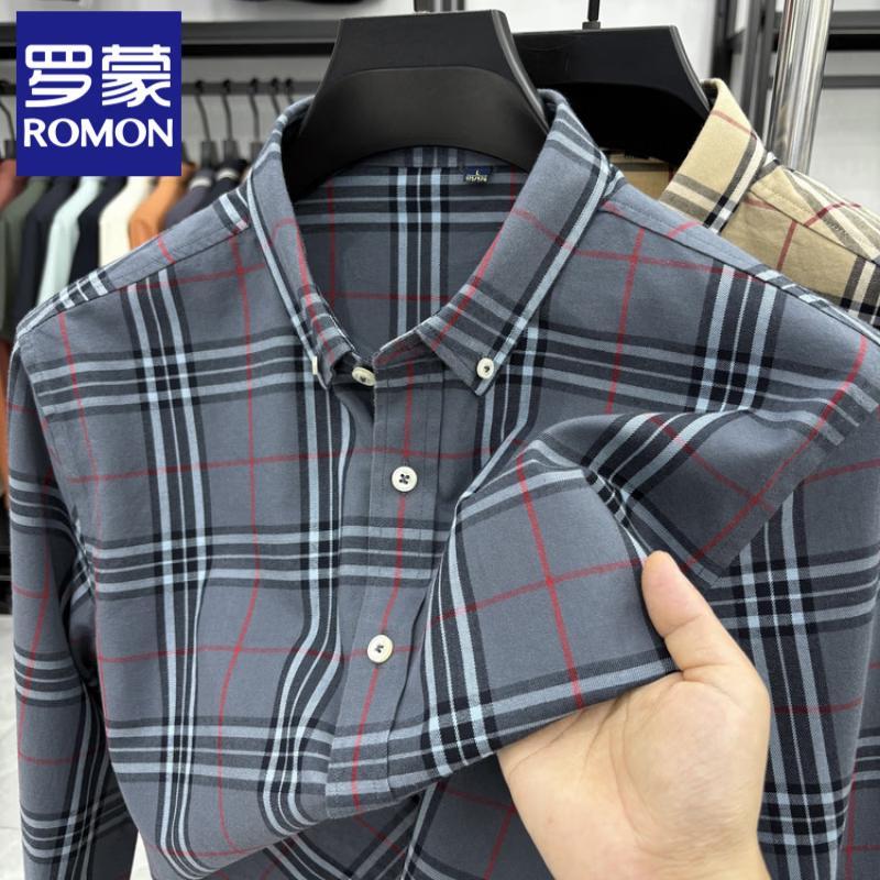 Romon Men's Plaid Long-Sleeve Shirt cm