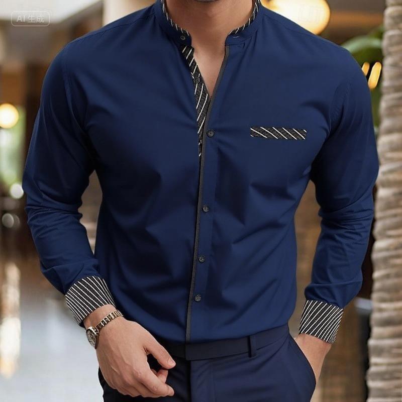 New Men's Color Contrast Trend Fashion Stand-up Collar Long-sleeved Shirt Casual Top cm blue