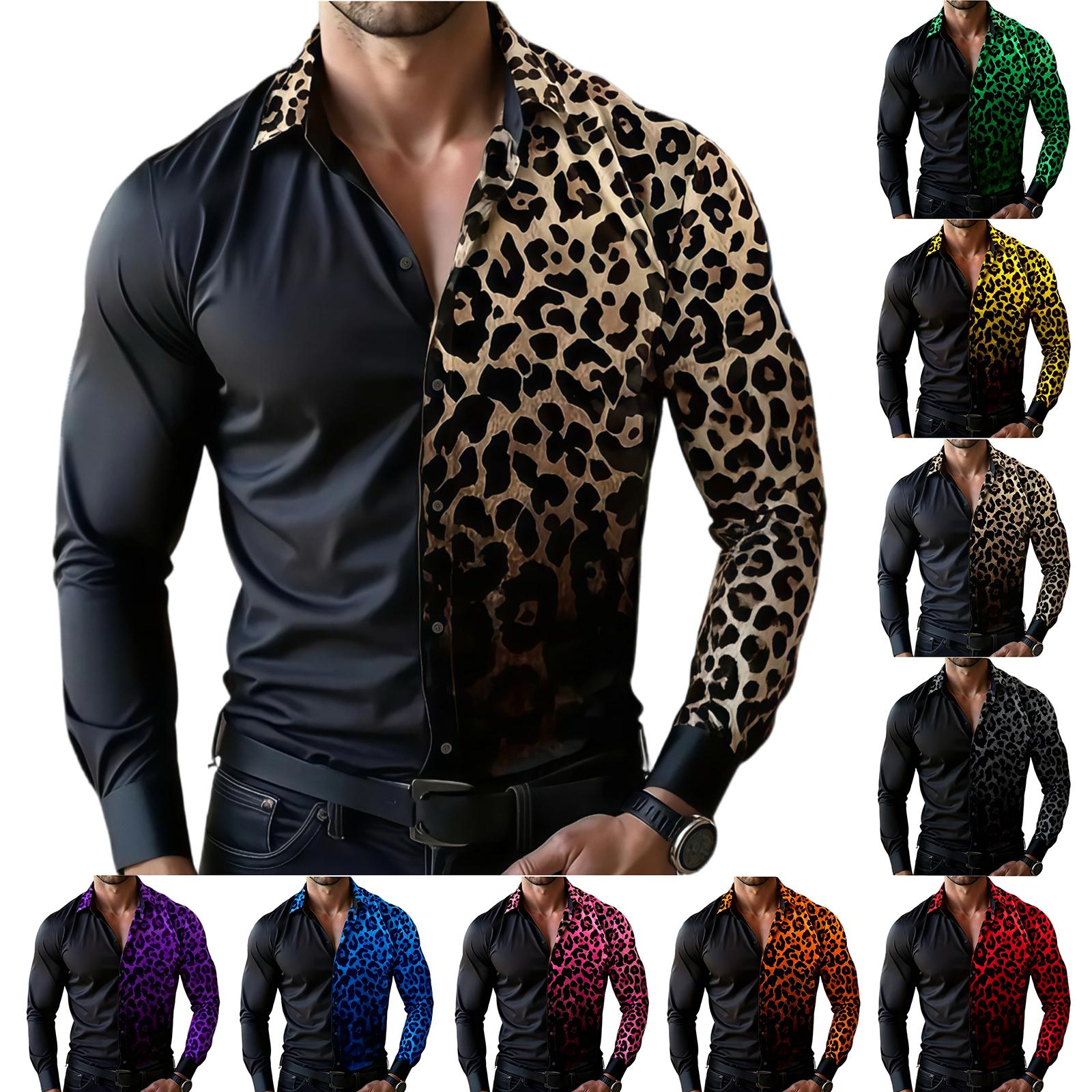 Men's Holiday Casual Leopard Print Long-sleeved Lapel Button-down Shirt cm khaki