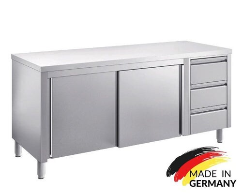 VM Europa Edelstahl Arbeitstisch mit Grundboden, 3 Schubladen rechts, Premium - montiert: 160 x 60 cm / mit Aufkantung / ohne Zwischenboden