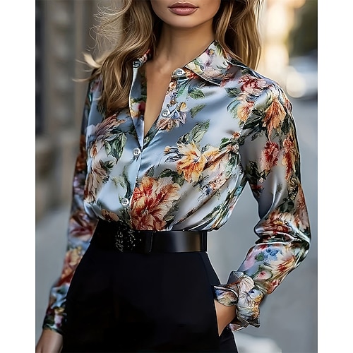 Per donna Camicia Elegant Raso/Satin Top estivi Floreale Grafico Semplice Elegante Vintage Signore Manica Lunga Colletto a Camicia Top Regolari Quotidiano Lavoro Ferie Arricciato Patchwork Stampato