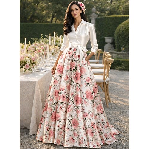 Linea ad A Lunghezza al pavimento Abito da invitata a nozze Abito Formale Abito da sera Abito da cerimonia per signora Manica 3/4 Colletto a Camicia Elegante Spacco Alto Formale Raso con Bottoni