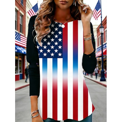 Giorno dell'Indipendenza Americana Per donna Maglietta Stampato Grafico Bandiera Bandiera Americana Elegante Classico Casual Manica Lunga Girocollo Top Regolari Quotidiano Blu Nero Bianco Rosso