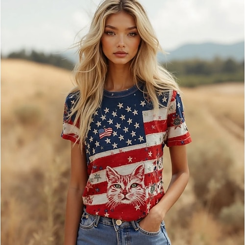 Giorno dell'Indipendenza Americana Per donna Maglietta Stampato Grafico Bandiera Americana Vintage Elegante Classico Manica Corta Girocollo Top Regolari Quotidiano Weekend Bianco Rosso Cachi Estate