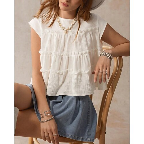 Per donna Blusa Tinta unica Elegante Casual Manica Corta Scollo a V Top Regolari Quotidiano Volant Traforato Bianco Giallo Rosa Blu Verde Estate