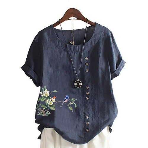 Blusa in lino simile cotone finto per donna stampa floreale stilosa casual maniche corte collo rotondo tops lunghi quotidiano bianco rosa blu navy marrone verde estate primavera