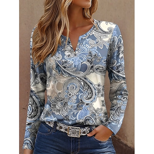 Per donna Maglietta Stampato Grafico Geometria Vintage Moda Moderno Manica Lunga Collo a V Top Regolari Quotidiano Weekend Blu Giallo Viola Verde Estate Primavera
