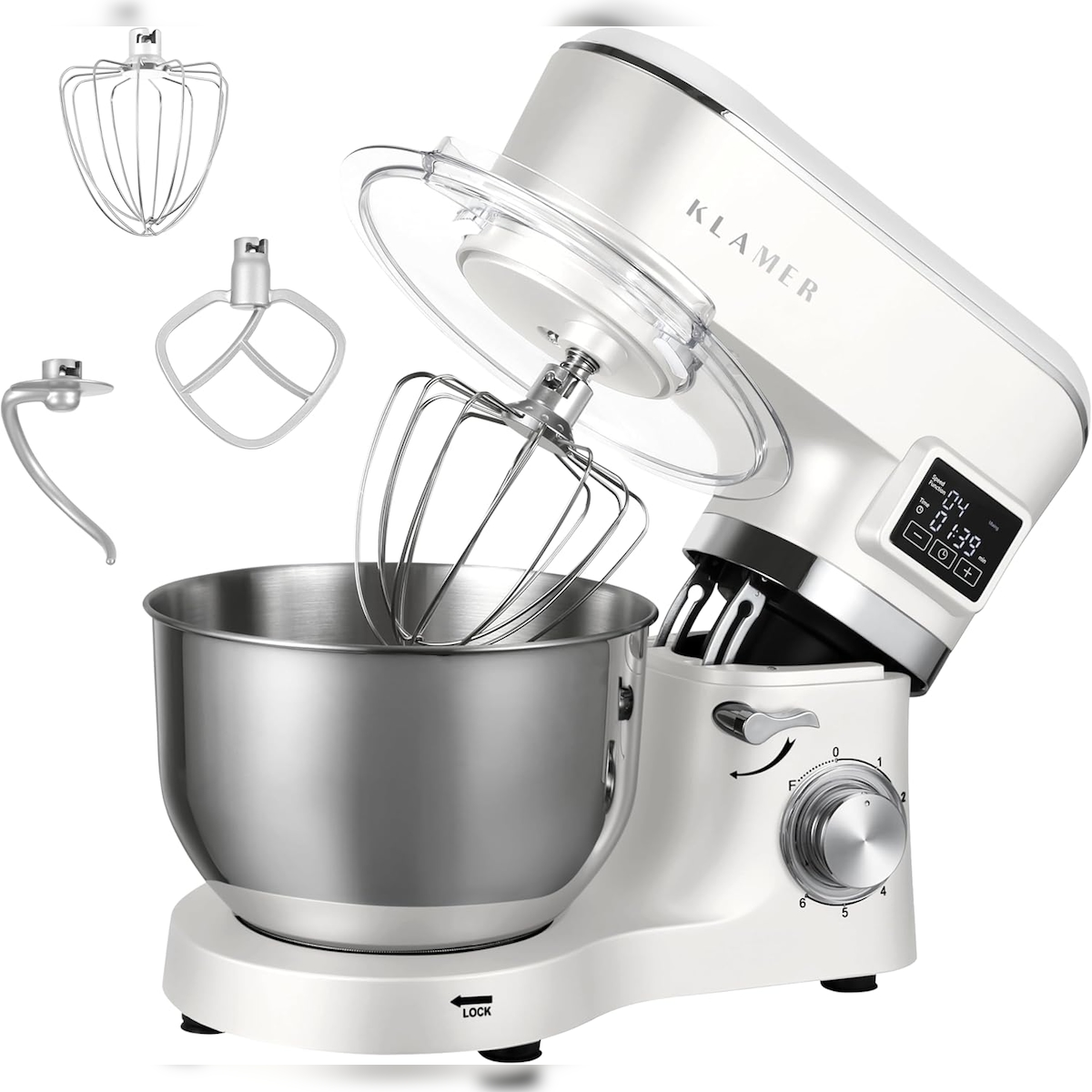 KLAMER Küchenmaschine Classic 1400 W – 5,5 L Rührschüssel aus Edelstahl, Knet-, Rühr- & Schneebesenaufsatz, Timer & LED-Display, stabile Saugnapffüße…
