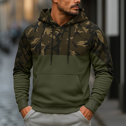 Per uomo Felpa con cappuccio Felpa con cappuccio in pile Nero Verde militare Con Cappuccio Mimetico Patchwork Blocco di colore Sport Outdoor Casuale Quotidiano Streetwear Cool Abbigliamento Sportivo