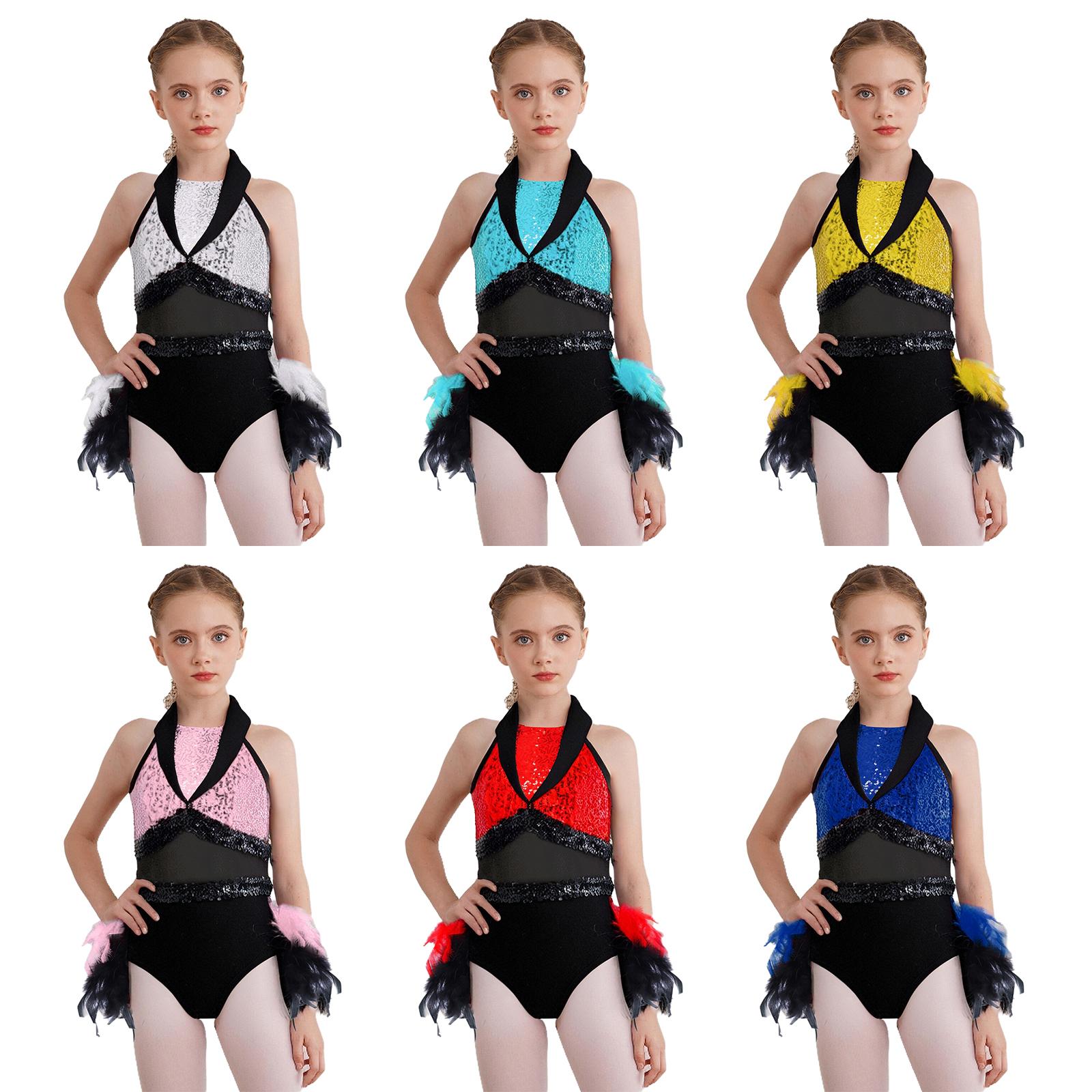 Girls Jazz Dance Leotard Turn-Down Collar Sleeveless Sheer Mesh Keyhole Back Shiny Sequins Feather cm pink