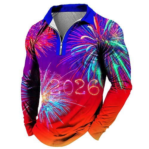 Capodanno Per uomo Fuochi d'artificio Polo Manica Lunga Magliette polo Bavero Casual Abbigliamento quotidiano Abito da festa Stampa 3D Polo con cerniera a un quarto Primavera Autunno Inverno Blu