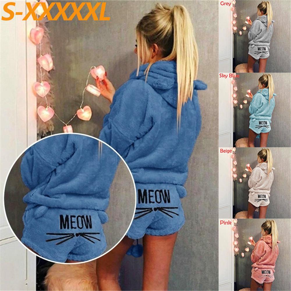 Women Two Pieces Soft Flannel Warm Winter Pajamas Set Cute Cat Pajamas Hoodies Sleepwear cm dark blue
