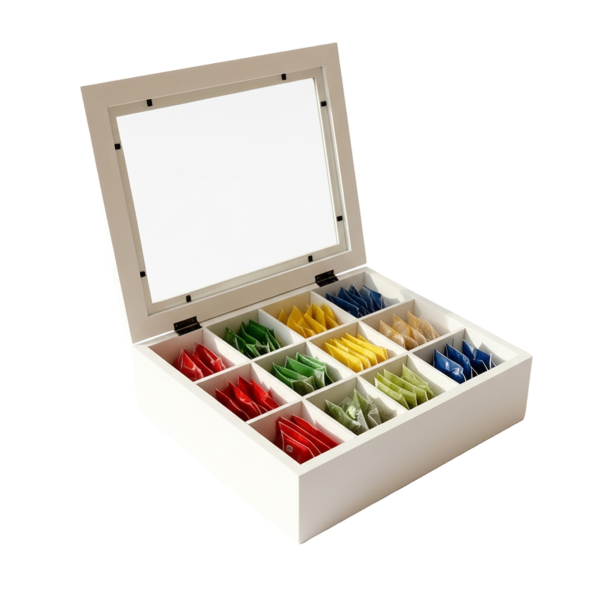 Relaxdays Teebox, 12 Fächer, Bambus, Teebeutel Aufbewahrung, Teekiste mit Sichtfenster, HxBxT: 8 x 28 x 23 cm, weiß