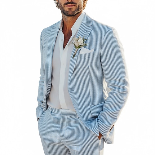 Uomo Casuale Matrimonio in Spiaggia Abiti in seersucker Bavero classico Giallo Rosa Casual Formale A righe Vestibilità su misura 2 pezzi Monopetto Due Bottoni