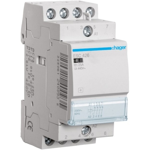 Hager Installationsschütz, 25A, 230V/AC, 400V/AC/DC, 4Ö, 1900W/AGL, 950VA/LL, 2TE