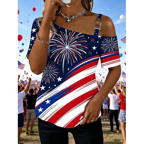 Giorno dell'Indipendenza Americana Per donna Maglietta Stampato Grafico Bandiera Americana Moda Classico Casual Manica Corta Monospalla Top Regolari Quotidiano Uscire Weekend Blu Estate Primavera