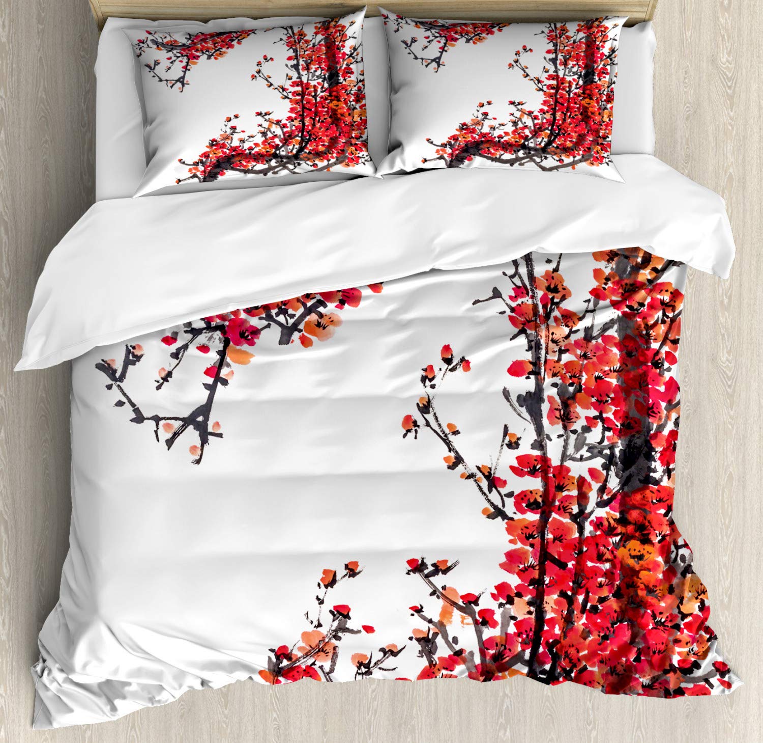 Japanese Duvet Cover Set,Branch Of A Flourishing Sakura Tree Flower Cherry Blossoms Spring Theme Art Japan Bedding Set Full Size