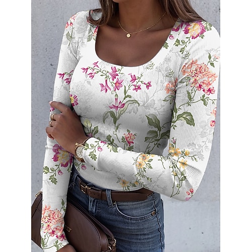 Maglietta da donna a manica lunga a coste Grafica Collo Quadrato Maglietta a manica lunga Casual Floreale Classica Top Regolari Quotidiana Stampa Verde Chiaro Rosa Rossa Blu Blu Polveroso Primavera