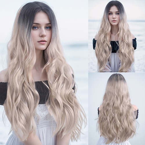 Parrucca Sintetica Onda d'acqua Tessitura riccia Taglio Scalato Con Frangia Fatto a macchina Parrucca 28 pollici A1 Capelli Sintetici Per donna Classico Confortevole Gradiente di colore Grigio scuro
