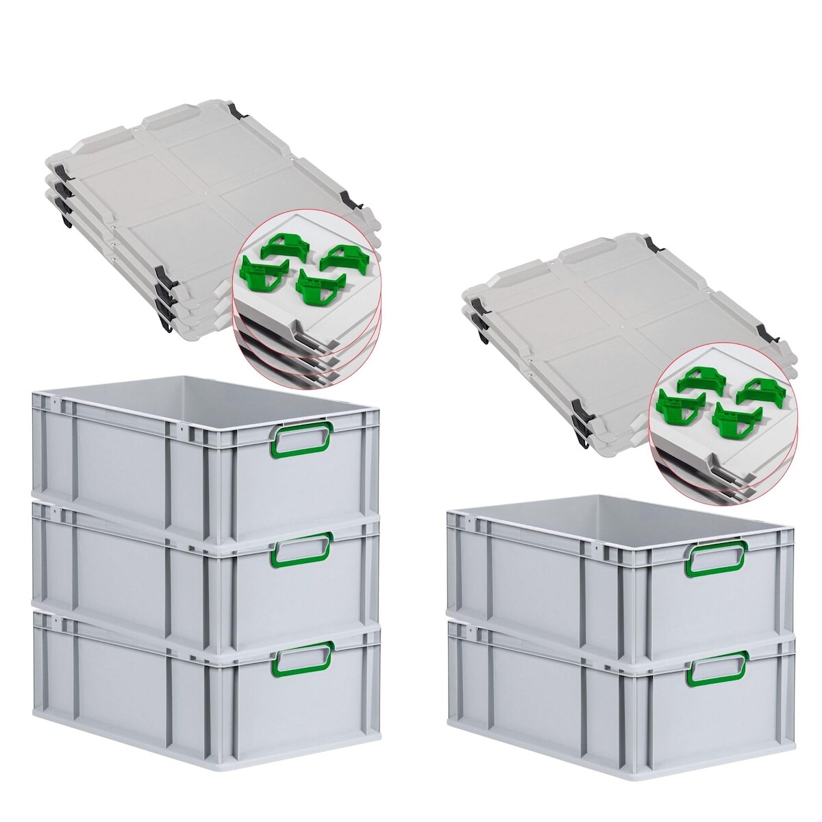 PROREGAL SparSet 5x Eurobox NextGen Color mit Auflagedeckel & Verschlüsse, HxBxT 22x40x60cm, 44L, Grau, Griffe grün zu, Eurobehälter, Box