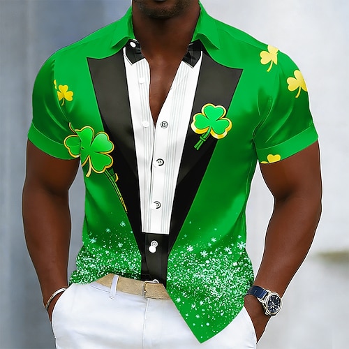 Camicia con colletto finto e design su divisa da uomo del giorno di San Patrizio Camicia in raso Camicia da abito Maniche corte Stile vintage retrò Festa Estate Primavera Colletto a risvolto Stampa