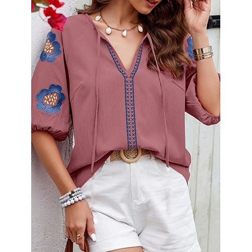 Per donna Camicia popover Camicia Estiva Camicia casual Blusa Ricamato Floreale Vacanza Elegante Casual Mezza Manica Scollo a V Top Regolari Quotidiano Spiaggia Ferie Blu Rosa Blu marino Albicocca