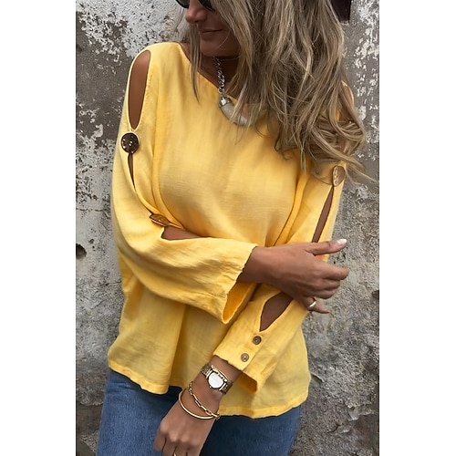 Per donna Camicia popover Camicia casual Blusa Traforato Tinta unica Vacanza Elegante Essenziale Manica Lunga Girocollo Top Regolari Quotidiano All'aperto Ferie Nero Giallo Viola Cachi Estate