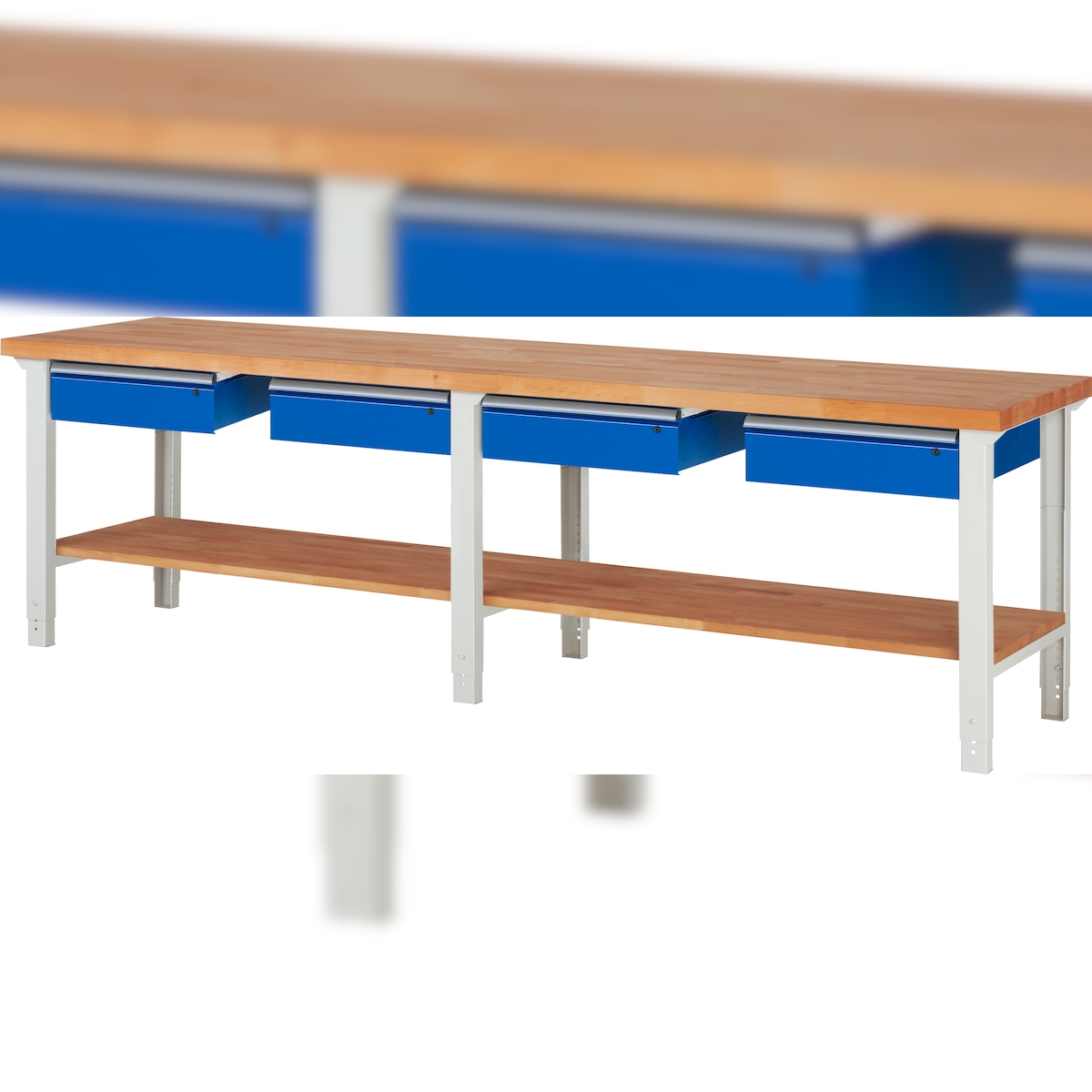 PROREGAL Werkbank Serie 7000 - Modell 7002 | HxBxT 79-114x300x70cm | 4x Schublade + Ablageboden | Schubladenmaße 4x150mm