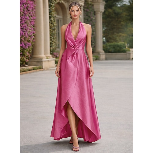 Linea ad A Lunghezza Tè Abiti da Cocktail Elegante Alto Basso Senza Maniche Scollo a V Festa in giardino Matrimonio Raso Taffetà Senza schiena con Pieghe