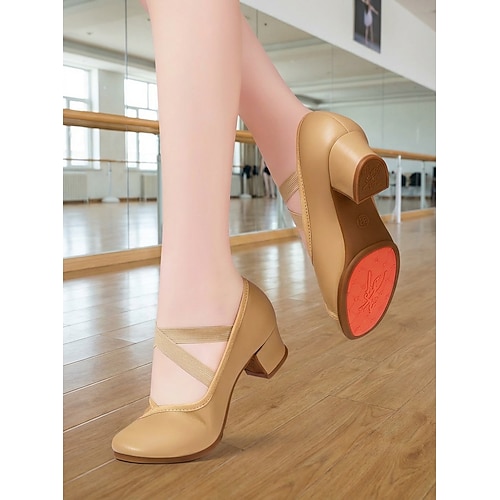 scarpe da ballo da donna con tacco basso color carne, supporto elastico incrociato, elegante stile mary jane per balli da sala danza contemporanea