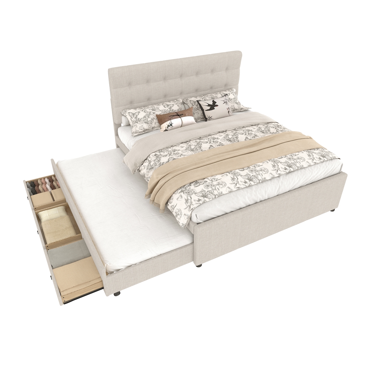 MODFU Polsterbett 140x200 mit ausziehbarem Bett, drei Schubladen und verstellbarem Kopfteil, Beige, für Gästezimmer und mehr