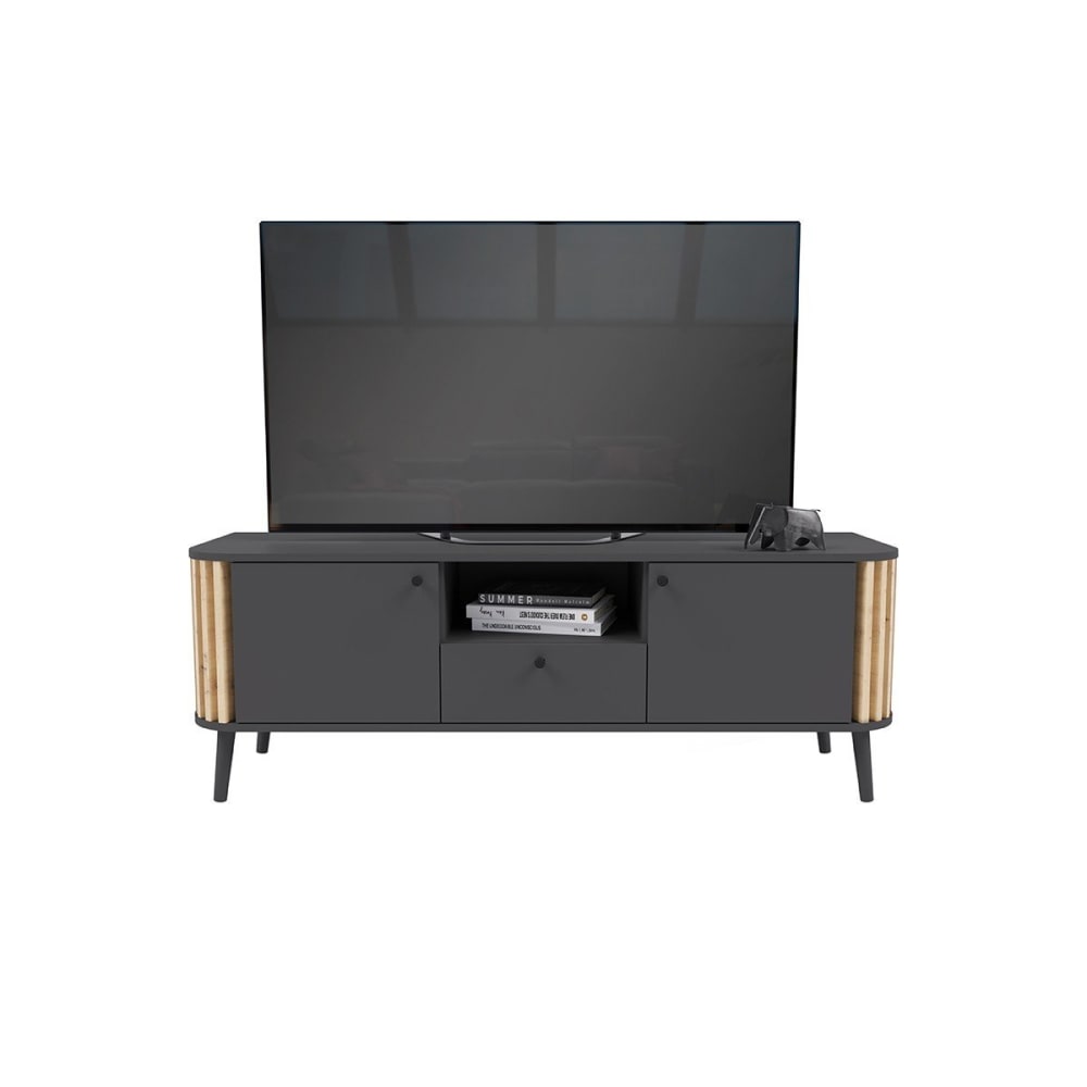 Meuble TV effet bois et noir avec 2 tiroirs et 2 portes coulissantes