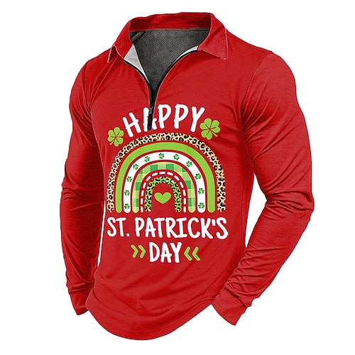 San Patrizio Per uomo Quadrifoglio Polo Manica Lunga Magliette polo Bavero Casual Abbigliamento quotidiano Abito da festa Stampa 3D Polo con cerniera a un quarto Primavera Autunno Inverno Nero Rosso