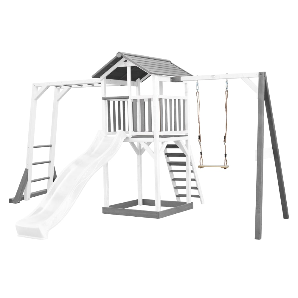 Parco giochi con arrampicata, scivolo e altalena, legno, bianco/grigio