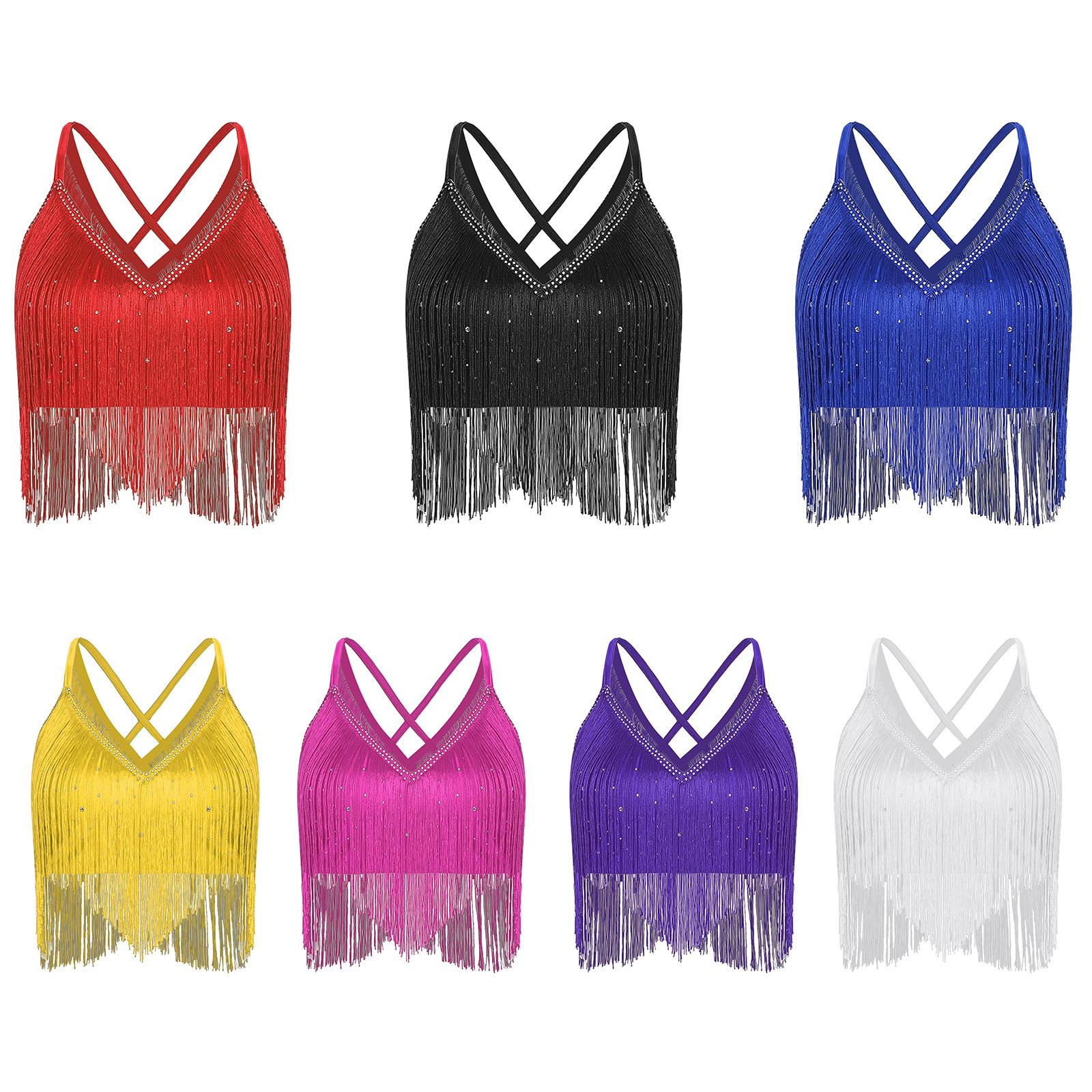 Dames Latijnse Dans Top Mouwloos V-hals Design met Gekruiste Rug en Franje Zoom voor Competitie cm zwart