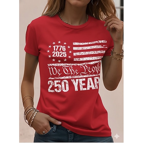 Maglietta da donna americana 250° anniversario, grafica, bandiera, vintage, elegante, classica, manica corta, girocollo, regular, per tutti i giorni, weekend, stampa, nera, estate, primavera, autunno,