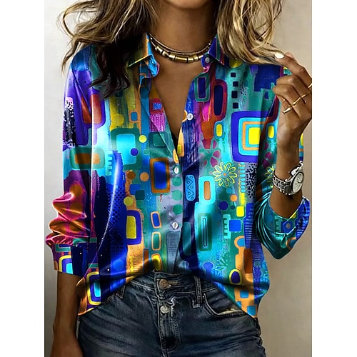 Per donna Camicia Grafico Geometrico Vintage Elegante Moderno Manica Lunga Colletto a Camicia Top Regolari Quotidiano Ferie Blu Estate Primavera