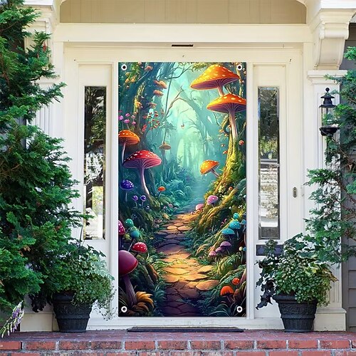 Banner per porta da giardino zen 3D per la stagione primaverile, padiglione giapponese e vista sul ponte ad arco, fiori viola appesi, banner per porta per l'arredamento della casa in veranda