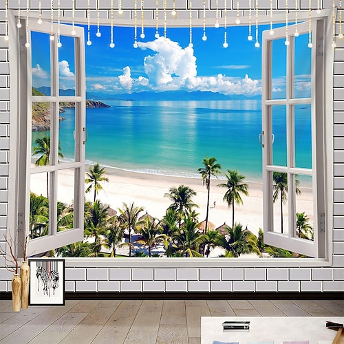 Arazzo da parete con vista sulla spiaggia in 3D, finta finestra, oceano, palme tropicali, paesaggio costiero, decorazione da parete per soggiorno, sala yoga