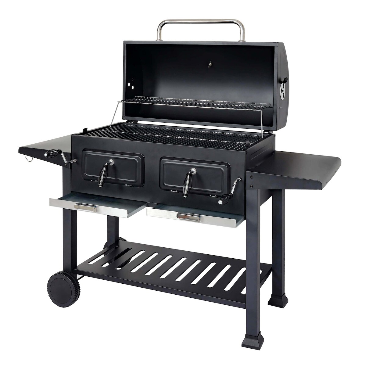 Mendler Holzkohlegrill HWC-K94, Grillwagen Standgrill BBQ Gartengrill mit Deckel Ablage, Stahl Emaille 110x153x60cm schwarz