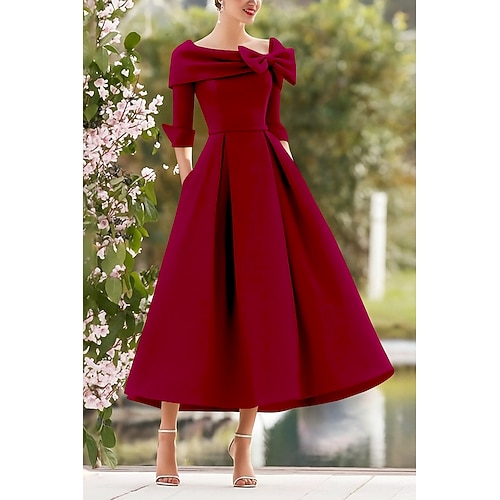 Linea ad A Lunghezza Tè Abiti da Cocktail Abiti da festa Elegante Vintage Manica 3/4 Collo quadrato Matrimonio Formale Tasca Raso con Fiocco/Fiocchi Tasca
