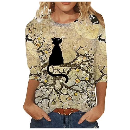 Maglietta da donna di San Patrizio T shirt Tee Nera Bianca Gialla Gatto Volant Stampa Maniche Lunghe Casuale Weekend Base Collo Rotondo Vestibilità Normale Dipinto Gatto S