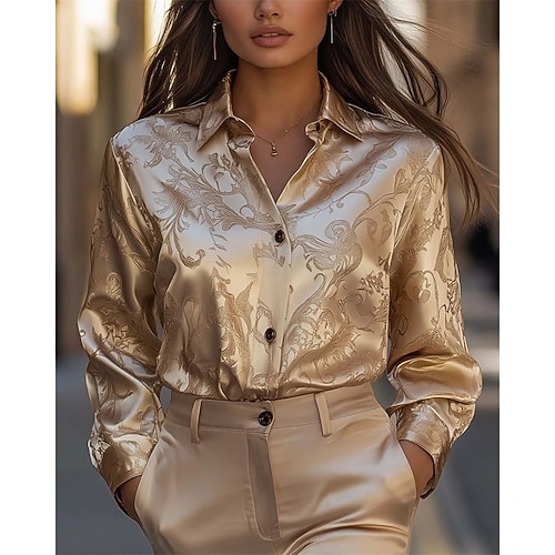 Per donna Blusa Top Eleganti Floreale Grafico Semplice Elegante Vintage Signore Manica Lunga Colletto a Camicia Top Regolari Quotidiano Lavoro Ferie Arricciato Patchwork Bottoni Oro Primavera Autunno