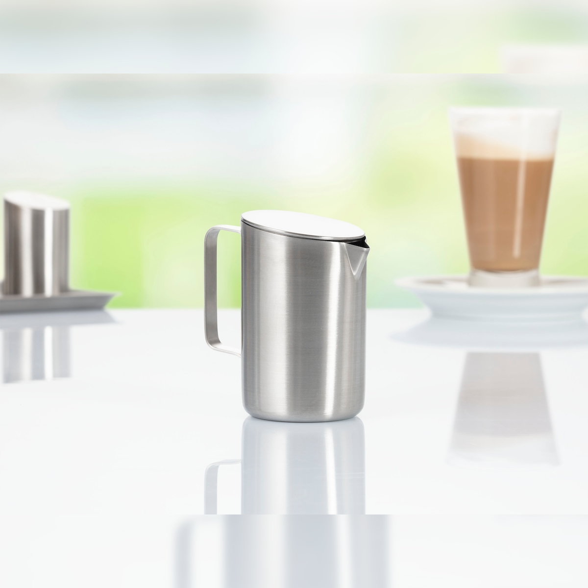 Caterado Milchkännchen mit Deckel VISTA, Durchmesser: 92 mm, Höhe: 10 mm, Inhalt: 200 ml, mit gebürsteter Oberfläche,
