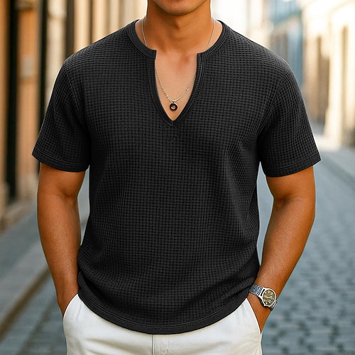 Per uomo Maglietta Waffle Maglietta Manica Corta Scollo a V Aperto davanti Estate Tutte le stagioni Tinta unica Testurizzato Moda Designer Casual Scollo a V All'aperto Casuale Quotidiano Nero Bianco
