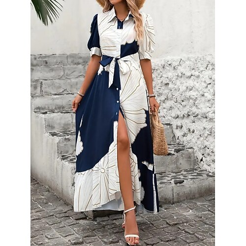 Per donna Abito Lungo Maxi Abito Abito Camicia Abito Floreale Elegante Moda Moderno Quotidiano All'aperto Vacanza Vestibilità regolare Floreale Manica Corta Colletto a Camicia Blu scuro Estate