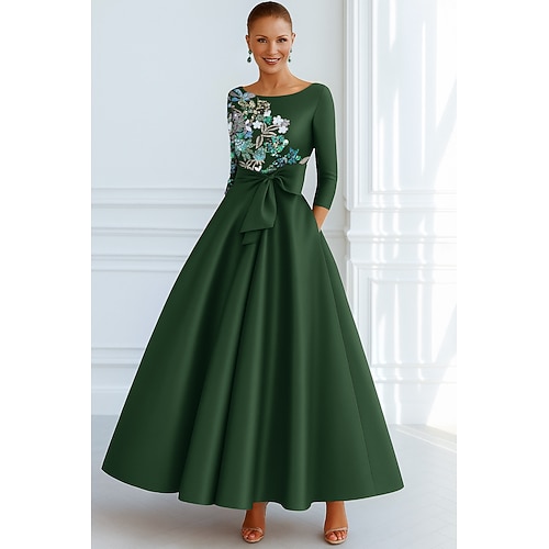 Linea ad A Lunghezza al pavimento Perline ricamate Abito Formale Abito da madre della sposa Abito da Sera Da principessa Abito formale Elegante Setoso Manica 3/4 Girocollo Matrimonio Formale Tasca