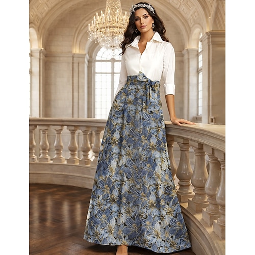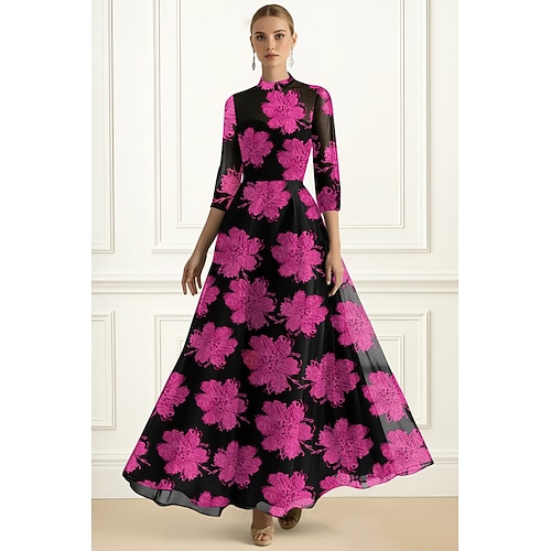 Linea ad A Lunghezza al pavimento Abito da Sera Abito formale Elegante Quotidiano Abiti semi formali Manica 3/4 Collo Alto Festa in giardino Matrimonio Organza Jacquard con Stampa floreale